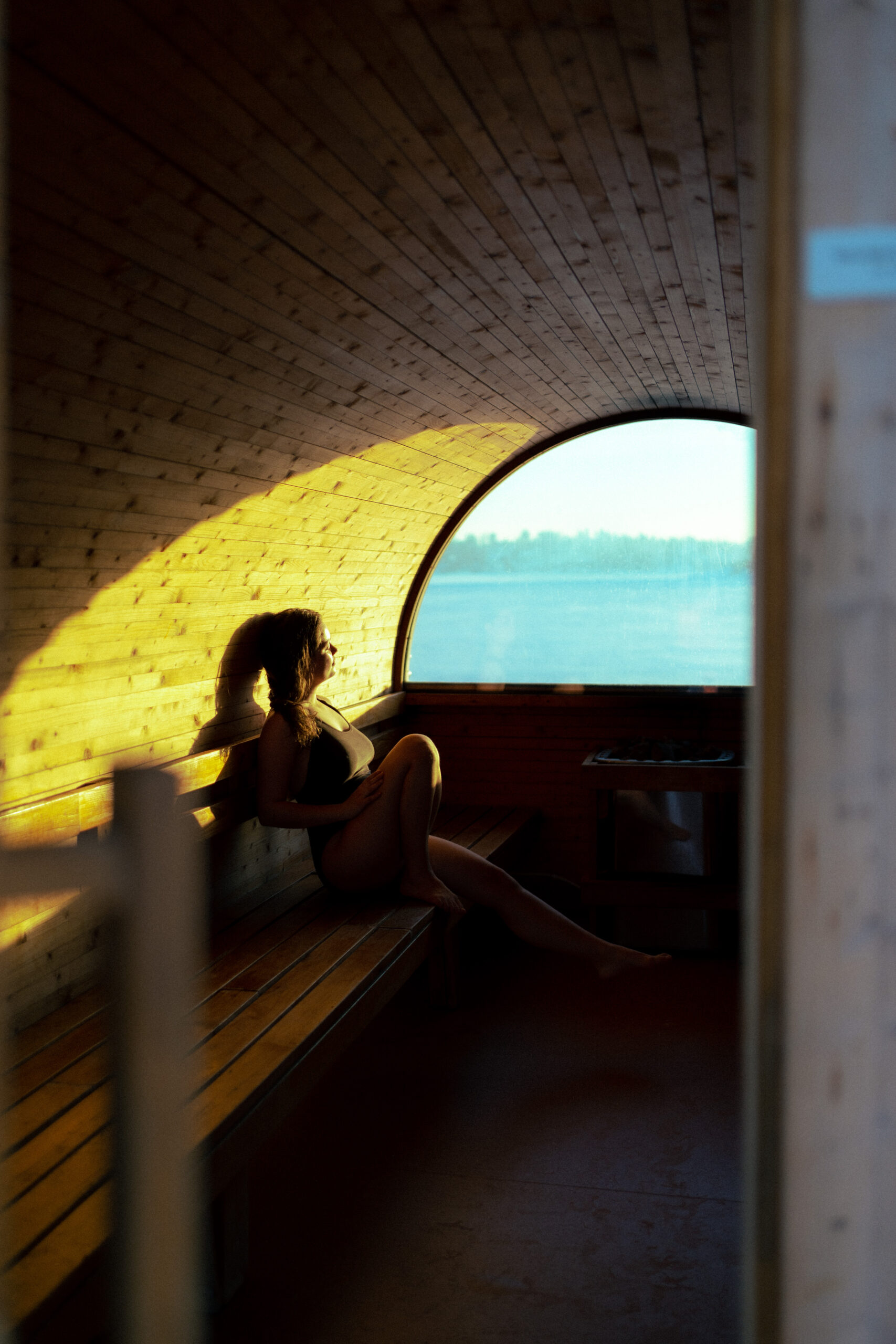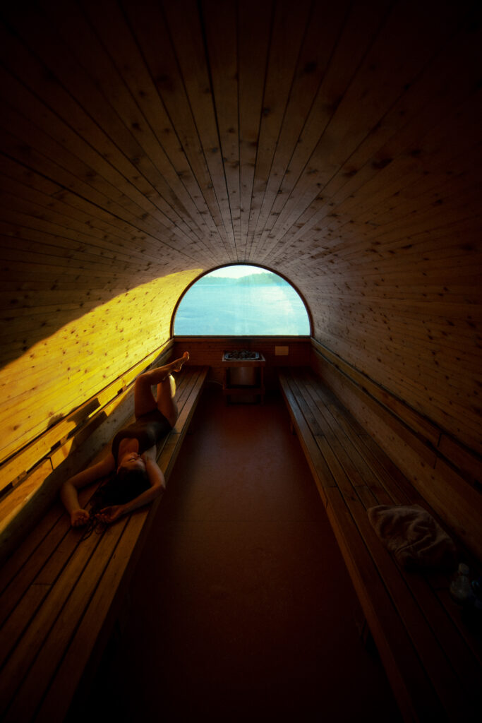 Opplev Utkikksbadstuen – en intim badstue i 2. etasje, perfekt for vennegjengen eller familien, med plass til opptil 10 personer. Her ligger temperaturen på behagelige 80°C i sittehøyde, noe som gir en komfortabel og avslappende opplevelse.