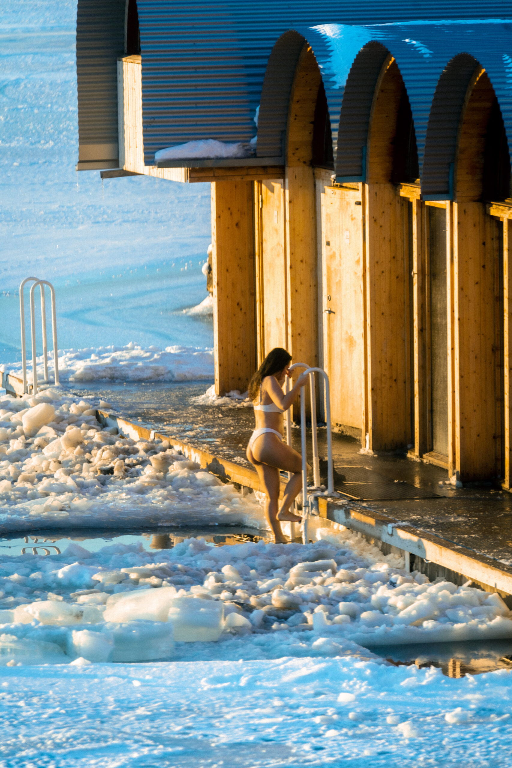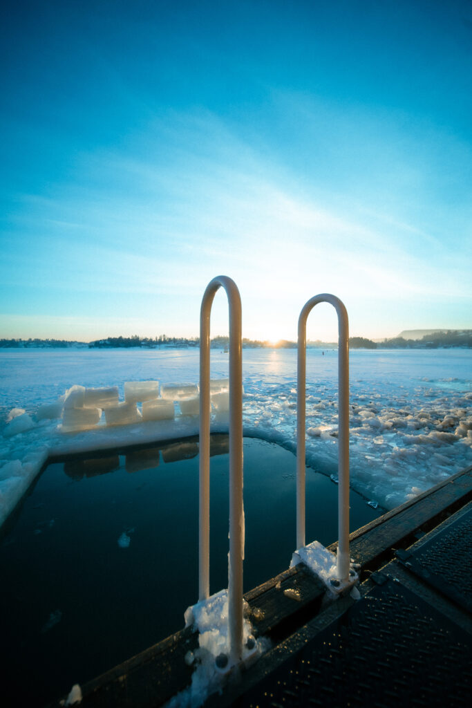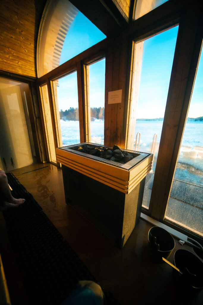 Opplev Fellesbadstuen – en romslig badstue med tre nivåer, som kan romme opptil 20 personer. Her kan du nyte en variert temperatur, fra rundt 75°C på nederste nivå, 85°C på midterste nivå og opp mot 100°C øverst – ideelt i kombinasjon med et oppfriskende sjøbad!
